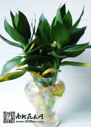 百合科龙血树属常绿直立灌木,很适用于室内水养花卉。富贵竹的叶片翠绿,茎秆笔直,圆形似竹。叶卵形先端尖,叶柄基部抱茎。它是极耐阴植物,在弱光照的条件下,仍然生长良好,挺拔强壮。可以长期摆放在室内观叶,不需要特别养护,只要有足够的水分,就能旺盛生长。水培时,将富贵竹茎秆切成20厘米以上的小段作为插穗插在水中,只要插穗的1/3能浸在水中就可生根成活。