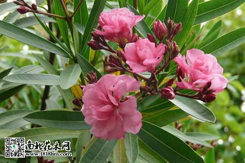 夹竹桃为夹竹桃科夹竹桃属的常绿灌木或小乔木。叶革质狭长。花期6一10月,聚伞花序顶生,花白色或红色。有趣的是,凤仙花科的凤仙花在古代亦有夹竹桃之称。《群芳谱》云:"凤仙……叶长而尖,似桃、柳叶,有锯齿,故又有夹竹桃之名。"