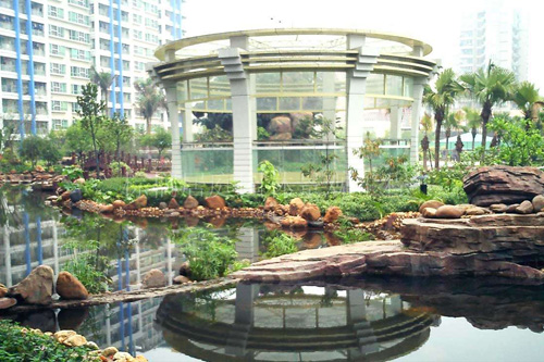 构筑物小品旁植物配置必须依照构筑物形态进行,可规则、可自然,但都需层次丰富,让构筑物能融入整个绿化之中。