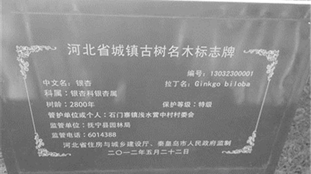 记者看到该银杏树与村民家毗邻而居,树下四周已被护栏保护起来,并设立了保护标志牌,几个主干分枝也安装了支架。从立于2012年的《河北省城镇古树名木标志牌》上记者了解到,这株银杏树为国家特级保护名木,银杏树树龄已有2800多年,树高18米,树围7.44米,冠幅平均22.5米,东西25.5米,南北19.5米,生命力极其顽强,每年还能结白果100千克左右。由于树龄偏高,中空的树洞中抽生10条粗细不等的枝根,向树洞内土壤中扎入,从根部又萌生3条以上新枝。